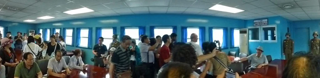Together, we were taken to the room where peace negotiations of the Korean war had been held. Us Westerners were guided to sit and stand on one side of the negotiation table, the Chinese groups on the other.